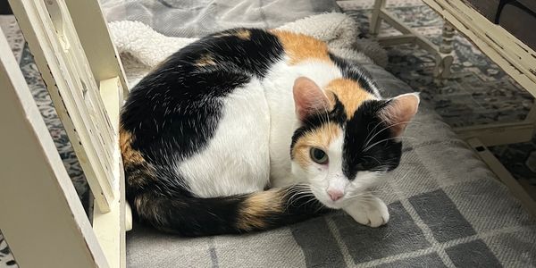 We found Cali in the Chicken Coop eating scratch grain. After trapping her and keeping her in a bathroom for a couple of months, she decided we were ok and has become a great addition to the household.